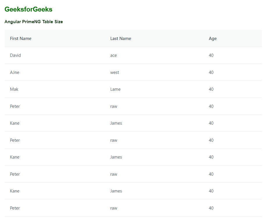 例子3:下面是另一个演示Angular PrimeNG Table Size使用的例子,我们正在制作一个大尺寸的表格。