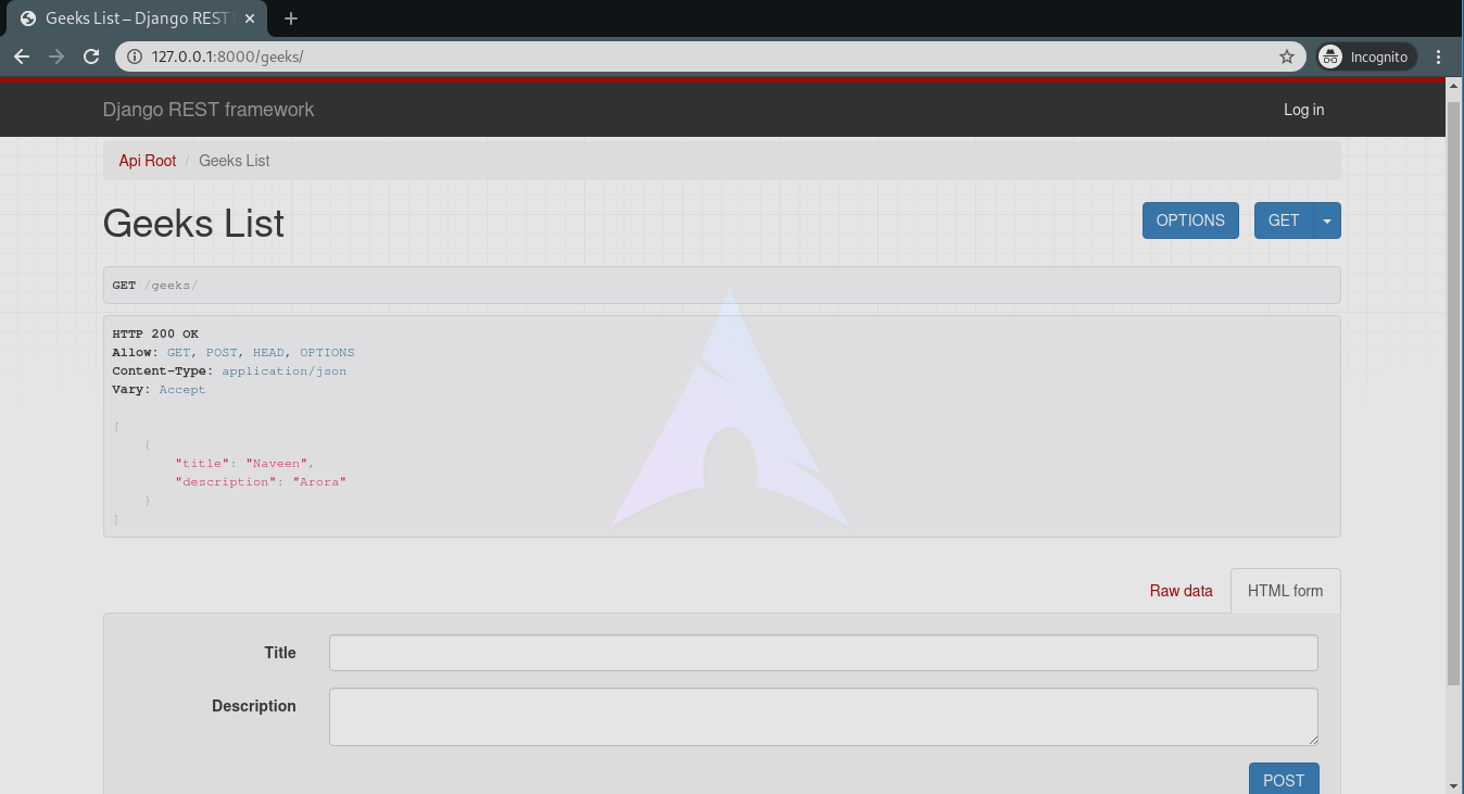 现在访问http://127.0.0.1:8000/geeks/ 。
