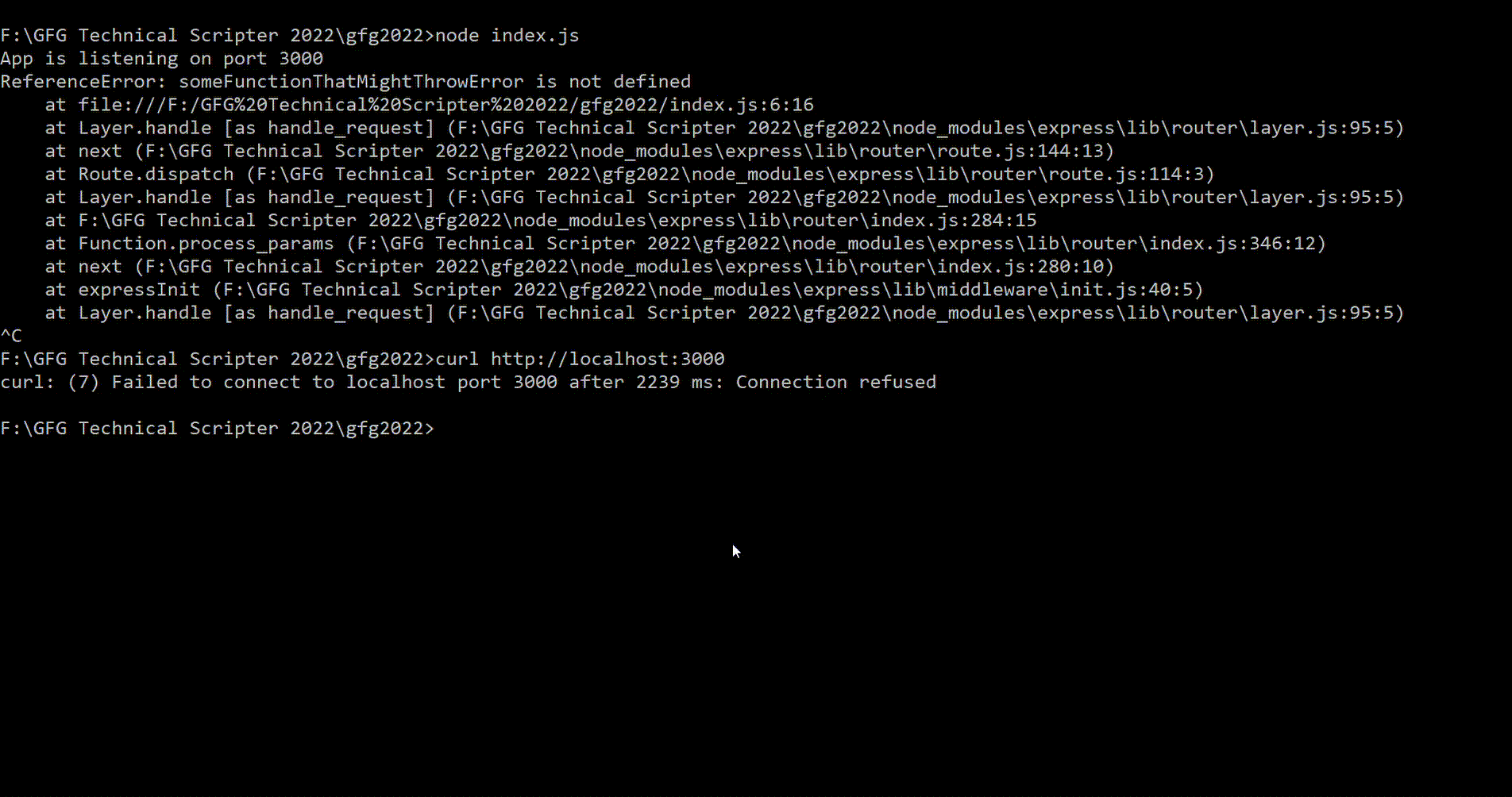 - 如果您向应用程序发出请求并且自定义中间件抛出错误,将显示此输出。错误堆栈跟踪将被记录到控制台,并且发送给客户端的响应将具有状态码500和消息“Something went wrong!”。